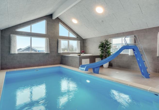 Swimming holiday no matter the time of year – sounds great, right? The holiday homes we rent out in Fjellerup are all just a short walk from the beach, but if it is too cold for a dip in the sea, you can always make use of the facilities in the holiday home instead. Our summer houses allow you to enjoy some time in the water no matter the time of year. All of the holiday houses we rent out in Fjellerup have a pool area at one end of the house. Inside you will find a swimming pool – in some cases with a water slide and a counter-current system – a whirlpool and a sauna. The whirlpool is located in the corner of the pool room, so you can enjoy the bubbles at the same time as you keep an eye on the pool. The sauna is located in a room of its own, where a smaller group can sit and chat or where each of you can steal a moment of peace and relaxation to focus on well-being.