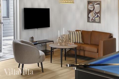 The spacious kitchen is fully equipped and located in the same open-plan space as the living and dining area, where you will find a long dining table with plenty of space for all guests to enjoy shared meals. Here, you can gather together and enjoy each other’s company in cosy and relaxed surroundings. Over in the living area, you can sink down into the soft sofas and watch a film or play some games – now that’s what we call a holiday!