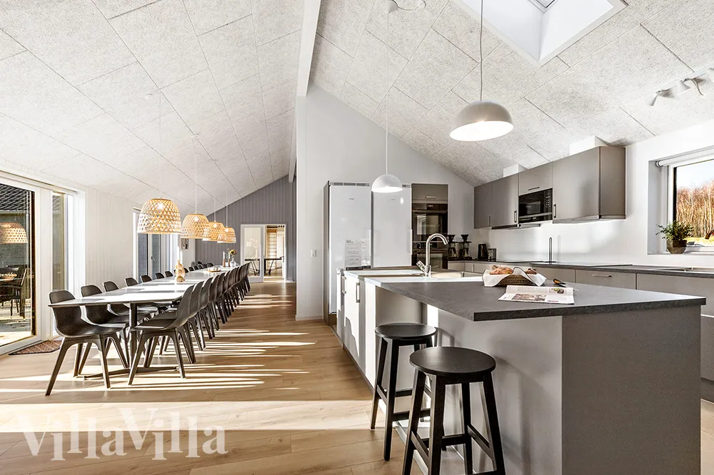 The property has an impressive XL kitchen, fully equipped with everything you could need to prepare meals for large groups, including two fridges, two dishwashers and two ovens. The open design allows everyone to be together while food is being prepared, and the large dining area has plenty of space to gather and enjoy meals as a group. Afterwards, you can sink down into the soft sofas and relax with a film or a game.