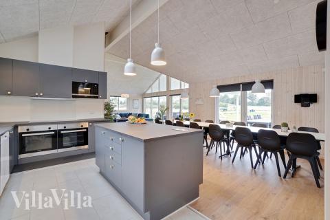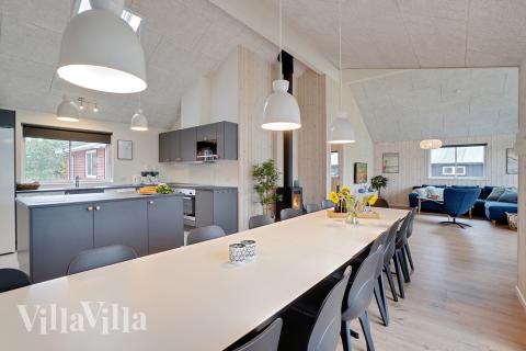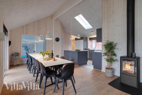 In the kitchen/living space you can relax by the cosy wood-burning stove or simply slouch back on the sofa and watch some TV. From the long dining table you can follow all the goings-on in the pool. The kitchen is large and well equipped with both an extra dishwasher and oven.