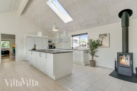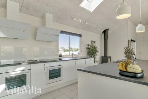 The large kitchen/living space has direct access to the terrace and makes for a natural place to gather and enjoy meals. The house has a very spacious and stylishly decorated kitchen. The kitchen has two dishwashers, ovens, sinks, cookers, fridges and one freezer. This makes it easy to serve up hot food for everyone at the same time and the dishes can be taken care of quickly. The kitchen/living space also has a wood-burning stove for a little extra cosiness on colder days. Everything you need for a proper holiday!