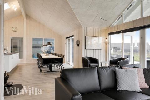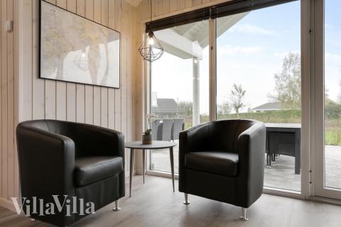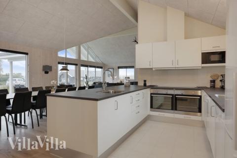 There is space for all 18 guests around the large dining table. The stylish kitchen is equipped to cook for all guests. There are two dishwashers, two sinks, two cookers/ovens and plenty of space in the fridge and the freezer. Not far from the wood-burning stove is a cosy sofa area with a TV. This summer house is well suited for multiple families who all want to holiday under the one roof.