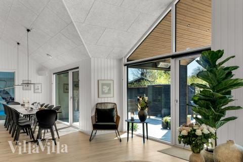 This inviting holiday home enjoys a fantastic location on a sloping plot that offers incredible views over the South Funen Archipelago and Lyø. Here, you will find a luxurious holiday home with pool, activity room and a completely private wellness area. The perfect setting for big families and friend groups looking for togetherness, relaxation and great experiences close to nature – and all within just a few minutes from a public bathing beach.