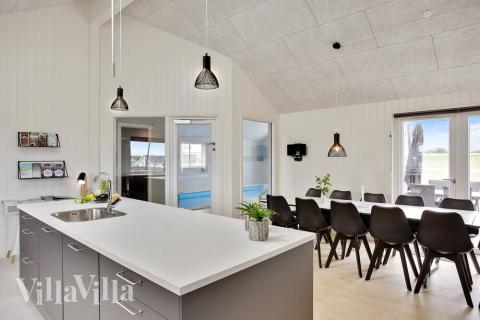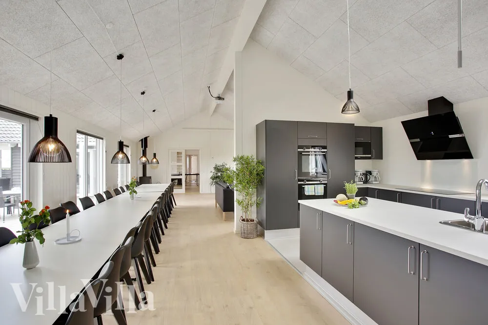 The large and beautiful kitchen has plenty of space and is practically furnished with an XL induction hob and two sinks, fridges, dishwashers, ovens, coffee machines, etc. The house also has a large freezer as well as a washing machine and tumble dryer.