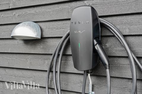 Electric cars can be charged via the high voltage outlet or the Tesla charger in front of the main entrance.