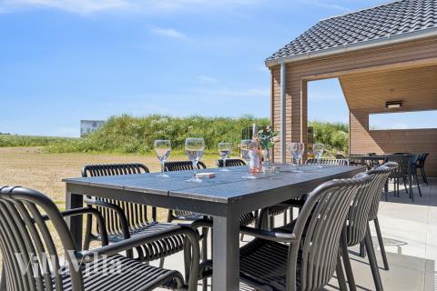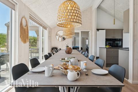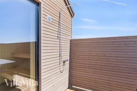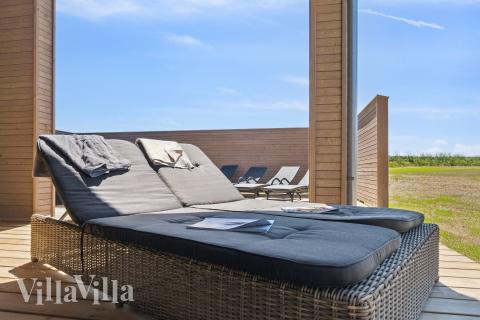 When it comes time to eat, you can gather together in the spacious common area which has a long dining table with room for everyone. The kitchen is an XL kitchen in size and features two ovens, two fridges and two dishwashers, making food preparation a breeze, even when cooking for large numbers. Outdoors, you can enjoy the exquisite wooden terrace which is kitted out with an outdoor whirlpool, outdoor shower and sauna – perfect for unwinding in the fresh air. The terrace is also covered in one part, so you can continue to enjoy the outdoors in the shade from the sun or sheltered from the rain. Kids will be sure to love the garden where they can jump to their hearts’ content on the trampoline or swing on the swing set. There is also a barbecue and garden furniture so you can spend long evenings dining al fresco.