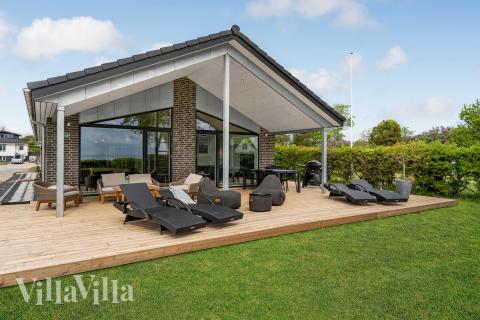 Outdoors, a lovely wooden terrace naturally becomes the gathering place on sunny days. Here you will find lounge furniture, outdoor beanbags and sun loungers, so everyone can find their favourite spot in the sun. Under the canopy, the dining table is ready for long dinners in the evening sun, while the view of the garden and the water provides a beautiful backdrop. The wilderness bath invites you to relax under the open sky – perfect after a day at the beach or a brisk walk along the coast.