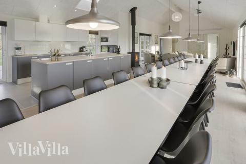 The bright XL kitchen has a kitchen island, two dishwashers, two sinks, two cookers, two ovens and no shortage of fridge/freezer space. The kitchen/living space also features a wood-burning stove, a cosy sofa nook and a long dining table.