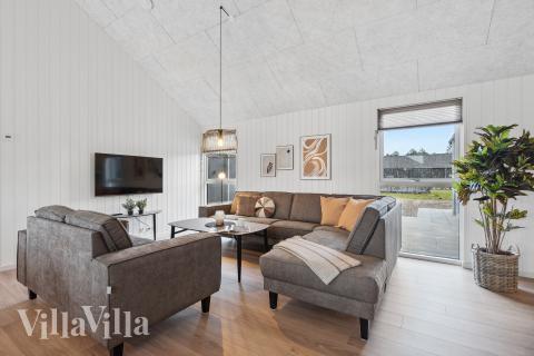The large living room is the natural gathering point of the house. The stylish XL kitchen is designed for many hands and large meals and is open to the dining area and living room. There is plenty of space around the long table, while the sofa area invites relaxation, games, and pleasant conversations.