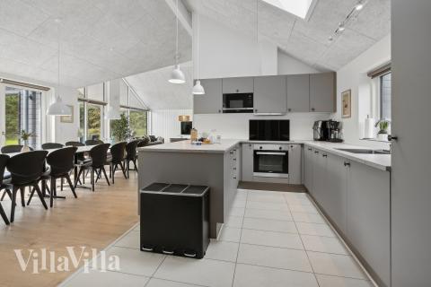 The living area of the holiday home is stylish and inviting, with a calm and exclusive atmosphere. There is plenty of space for gathering on the sofas while others set the table for shared meals. The functional and well-equipped kitchen provides a great setting for cooking together and enjoying cosy holiday meals.