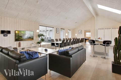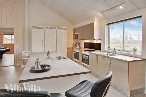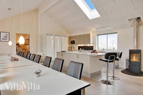 The house has a large combined kitchen and living space with a long dining table, a cosy sofa corner and a television as well as a well-appointed kitchen where you can prepare meals for many people. Among other things, the kitchen has two cookers/ovens, two sinks, two dishwashers and plenty of fridge and freezer space. The living space is also where you will find the summer house’s cosy wood-burning stove.