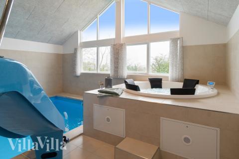 The undisputed highlight of the summer house, however, is without a doubt the wellness and swimming area. Here you can splash and swim in the 18 m2 pool with Roman steps and water slide. Or if you feel more like taking it easy than being active you may prefer the luscious sauna or whirlpool. Perfect for recharging your batteries. In addition, the wellness and swimming area also has a third bathroom which like the others also has a shower and a WC.