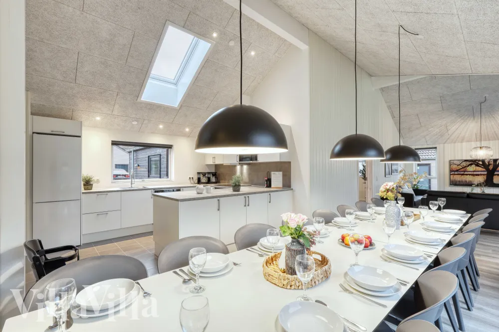 The pool house accommodates up to 16 people and offers everything you will need for a fantastic holiday experience. On arrival, you will be met by an impressive open-plan kitchen and living space, which is the heart of the home. The spacious and well-appointed kitchen is a dream for any chef, no matter whether you're whipping up a banquet or just fixing a quick snack. The long dining table is the perfect place to gather and enjoy meals together.