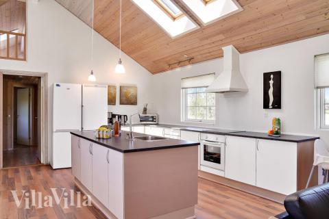 The focal point of the house is the kitchen/dining area, which is directly connected to the living room and its cosy wood-burning stove and tasteful furnishings. The kitchen is fully equipped with everything you will need on your holiday, and there is plenty of space for kitchen helpers who want to lend a hand.