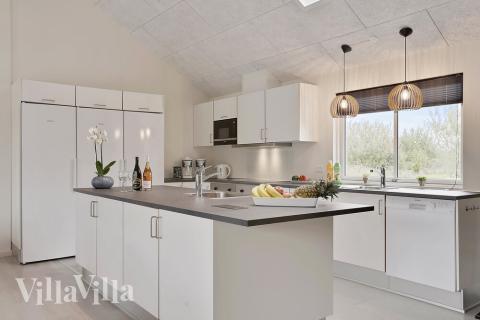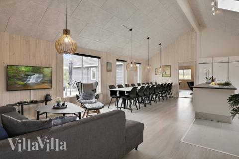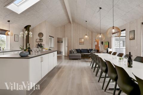 The summer house has a cosy living area with a long dining table with enough room for all 20 guests. From the sofa corner in the corner you can enjoy the warmth of the wood-burning stove and make yourself snug with a good book or film. The stylish kitchen is well equipped and has two dishwashers, two ovens, two sinks, two fridges and a large freezer, so cooking for many people will be no trouble at all.
