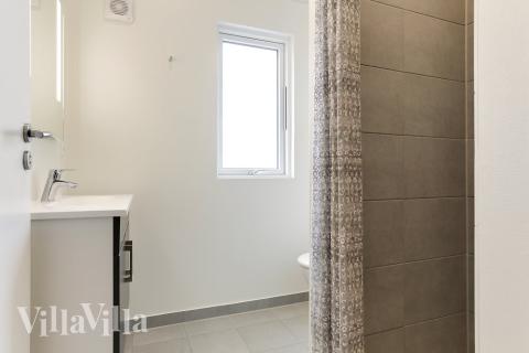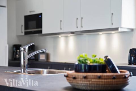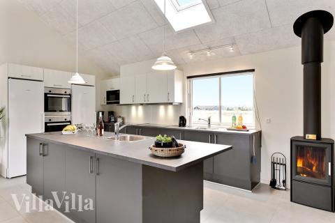The summer house has an extra large kitchen with doubles of the most important appliances: two ovens, cookers, sinks, dishwashers and plenty of fridge space. The kitchen has a kitchen island and is found in the same open-plan space as the living room. Everyone can gather around the long dining table or chill out in the cosy sofa over by the television. The kitchen/living space is also where you will find the home’s wood-burning stove.