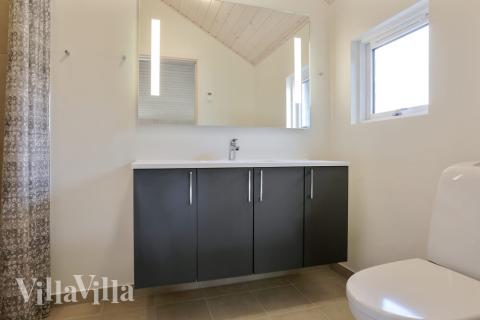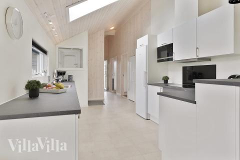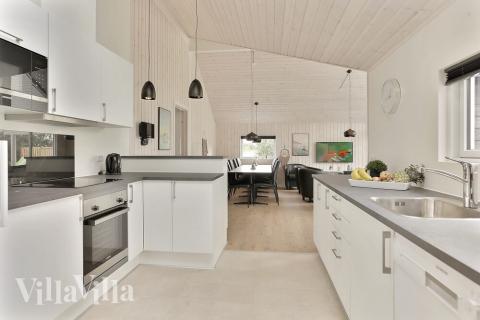 The house also has a cosy living space with dining table and sofa corner. Enjoy the heat of the wood-burning stove with a good film or book. The stylish kitchen is well equipped and within the same open-plan space.