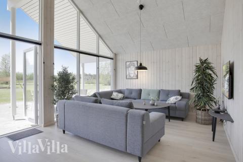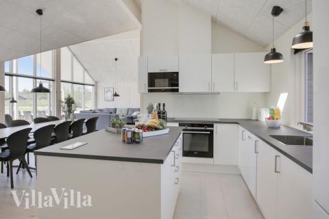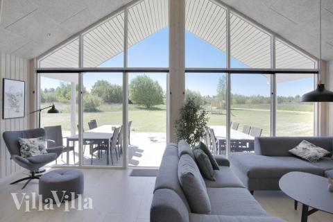 The heart of this summer house is the kitchen/living room. The stylish kitchen is well equipped while the long dining table offers views into the goings-on in the pool area. The cosy wood-burning stove is also located in the main living space and not far from the cosy sofa area in front of the TV.