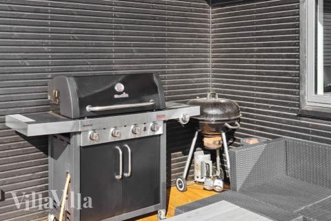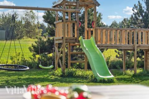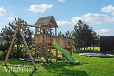 The enclosed garden is just perfect for families with kids. It has a trampoline, a play tower with swing set and a slide, as well as a couple of football nets – everything you need for endless hours of fun and laughter. In the evenings, gather around the fire pit in the garden to toast marshmallows, make s’mores, or simply enjoy that special atmosphere you can only get with a holiday by the coast.