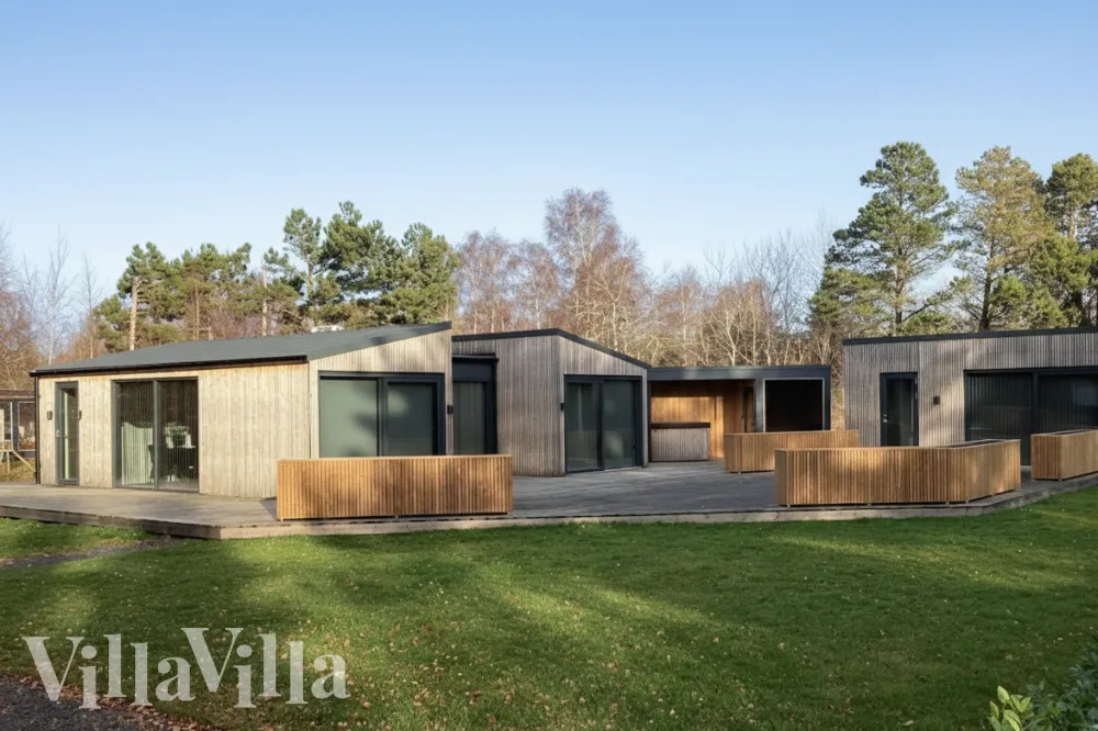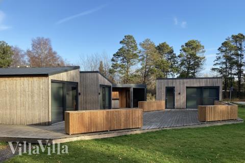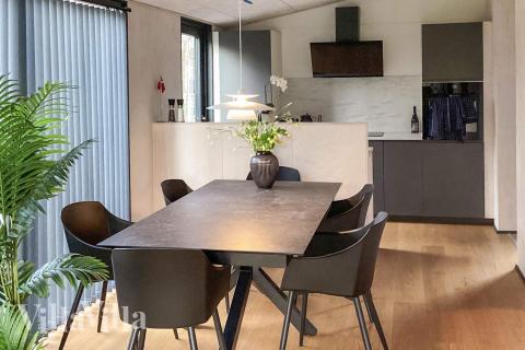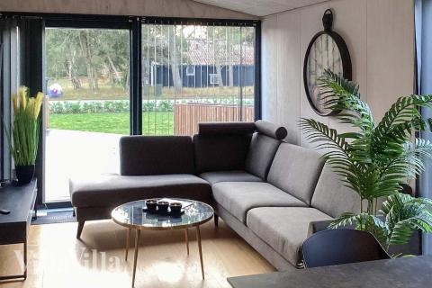 Outdoors, a large plot awaits with plenty of space for both play and relaxation. The large wooden terrace runs around the holiday home, allowing you to find sun, shelter and shade throughout the day. Here you can enjoy barbecues, quiet morning coffee or relaxing evenings in the lovely covered wellness area, where the wilderness bath, sauna and outdoor shower create a real holiday atmosphere.