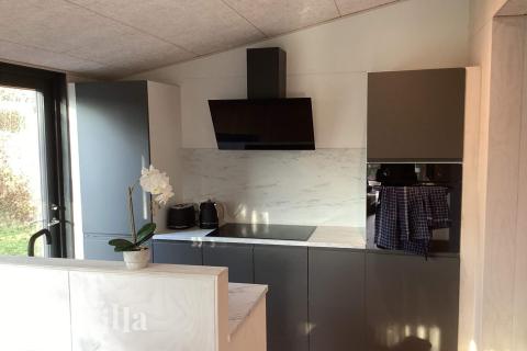 The holiday home is built in a modern and cosy style with a focus on comfort and warmth. The kitchen and living room are combined in one open living area, where holiday meals, games and conversations flow naturally together. The kitchen is equipped with everything you need to easily cook for everyone, while the living room invites you to relax with a sofa area, Smart TV and board games.
