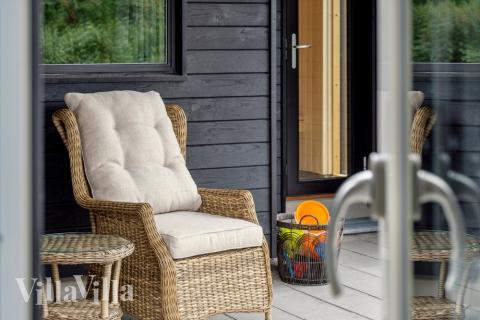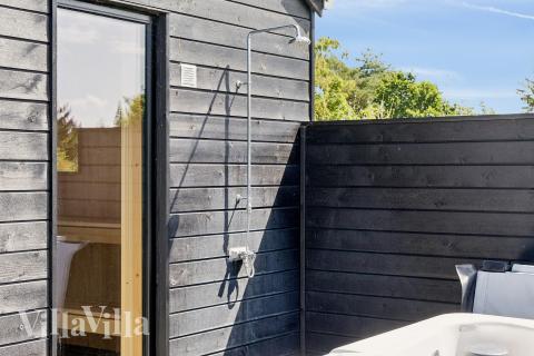 Outside you will find an exquisite outdoor whirlpool, a warm outdoor sauna and an outdoor shower with screen – pure wellness for both body and soul! Enjoy summer evenings with a barbecue while the kids romp around in the large garden with in-ground trampoline or play on the play tower with sandbox, swings and slide.