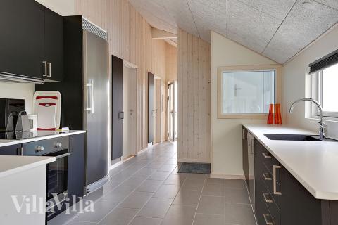 The house has its very own mini water park with 14 m2 swimming pool with water slide and counter-current system for hours of fun and play. Or if pure relaxation is more your style, then the whirlpool and sauna will be just the ticket for you. The kitchen has a view in to the pool room.