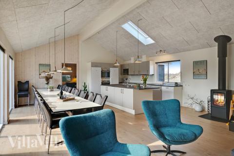 The large kitchen is located at the heart of the home and has two of almost everything: two dishwashers, ovens, cookers, sinks and fridges. The kitchen island and long dining table create a great space for chatting and socialising while you get creative in the kitchen. You will find the sofa lounge in front of the television and close to the house's wood-burning stove.