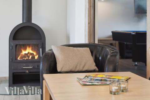 The natural gathering point of the house is the large and architecturally impressive combined living and kitchen space. The living room features a sofa area with flat-screen TV by the wood-burning stone and the pool area is visible from both the living room and the billiards room.