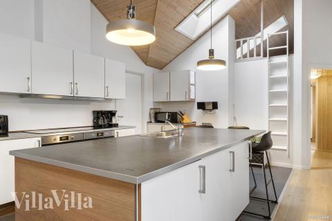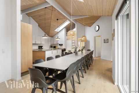The large kitchen has ample space for several cooks and it is naturally equipped with all modern conveniences. In the living room, you can relax in the sofa area by the wood-burning stove while you play a game, read a book or watch a film on the flat-screen TV.