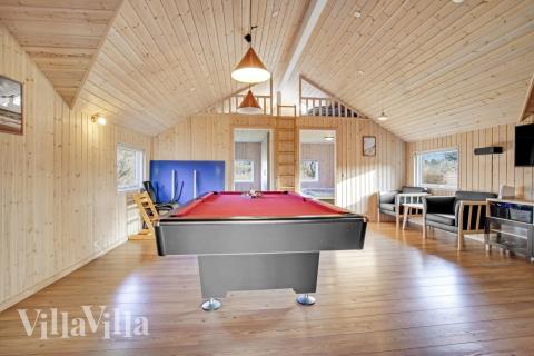 This beautiful pool house, built by Skanlux, is located close to Nr. Lyngby's wonderful sandy beach and its beautiful nature. Fans of the water can splash and swim for hours on end in the 15 m2 pool with water slide. After your swim, you can then relax in the house’s whirlpool with space for 4–6 people and its sauna. In addition to the house’s very own mini water park, there is also an activity room with billiards, table tennis, a... Read more