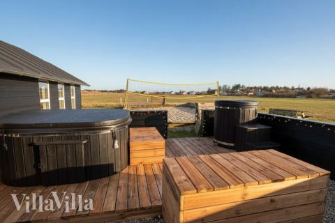Outside, you’ll find something to suit every taste. The holiday home boasts a beautiful wooden terrace with stunning views of the surrounding countryside. Here, you can unwind in the outdoor hot tub or enjoy a refreshing swim in the cold plunge pool. The active among you can enjoy a game of volleyball on the sand court, jump on the trampoline, have a kick about between the football nets or go for a swing.