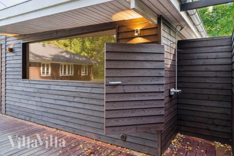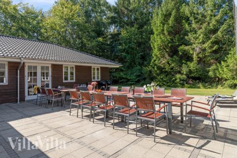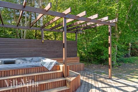 The house is located on an older natural plot with swings and plenty of space, while the children play, the adults can enjoy the outdoor wellness area. Here you'll find a lovely wooden terrace with a stepped outdoor spa under a pergola, a private outdoor shower and a lovely sauna with access to the garden. As an added bonus, there's also a large stone terrace that you can access directly from the holiday home's living area. End the day in good company around the cosy fire pit where you can enjoy the warmth of the flames under the starry sky.