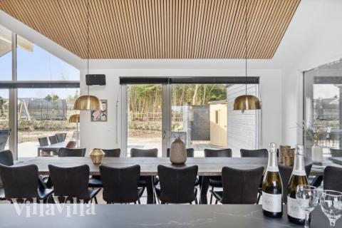 Inside, you will find everything you could wish for in terms of wellness and relaxation in luxurious surroundings. That is because the house is equipped with its very own wellness area. You can enjoy a moment of tranquility beneath the stars in the outdoor whirlpool or warm yourself up in the outdoor sauna. If you feel like being a little more active, you can take a dip in the indoor swimming pool with water slide and volleyball net. By the pool you will also find another whirlpool with space for 7–9 people.