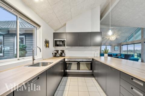 At the centre of the home is a large living space with a wood-burning stove where you will also find a long dining table with space for all 18 guests. Plus a sofa corner where you can cosy up in front of the TV. The kitchen is well equipped with two dishwashers, two cookers and ovens.