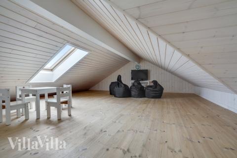 Great emphasis is placed on activities and cosiness – we are thinking in particular of the house's impressive pool area, which has an 18 m2 pool with water slide and an inviting six-person whirlpool, as well as a large sauna. In the house's large activity room, you can play billiards, table tennis, darts, table football or PlayStation 4, and there is a cosy bar with a fridge.