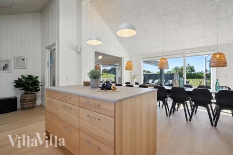 Next to the activity room is the open-plan kitchen and dining space which is the heart of the home. The modern kitchen is equipped with everything you need to whip up delicious and tasty dishes. The large dining table has enough space for all 18 guests to gather around and the cosy sofa area makes for the perfect setting to enjoy relaxed moments in each other’s company. The kitchen/dining space makes for an inviting setting to share meals and create cherished memories together.