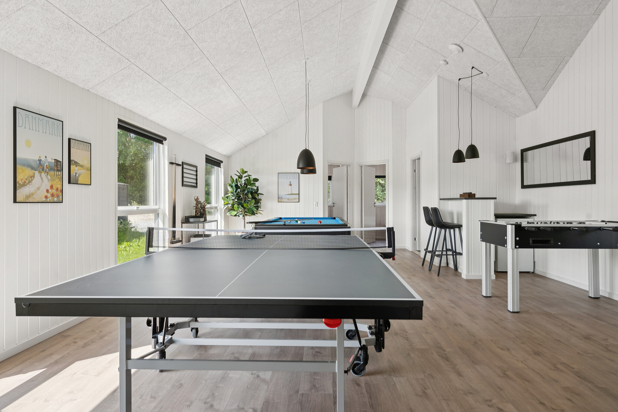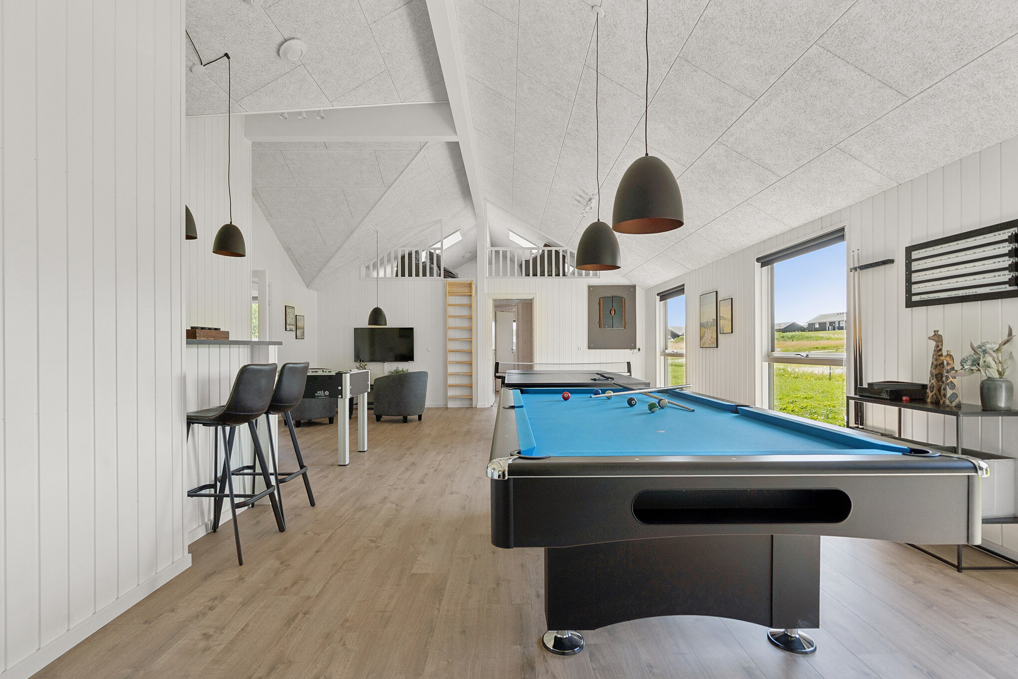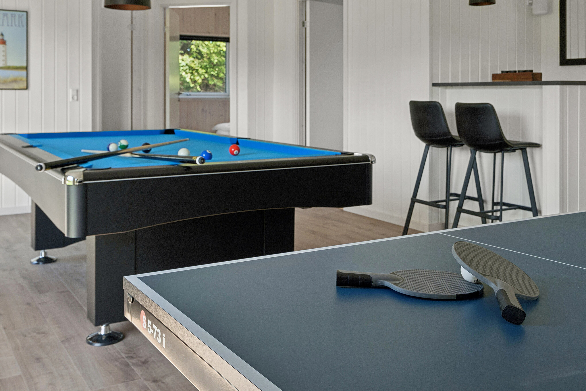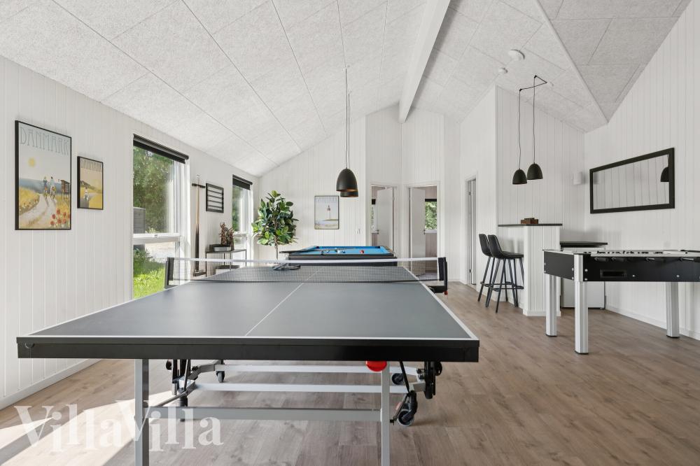 The kitchen and living space also offers direct access through to the holiday home’s large activity room. Here you can go head to head in games such as billiards, table tennis, darts and table football. After a pulse-raising competition, you can then quench your thirst at the bar in the activity room – just remember to bring along your own ingredients.