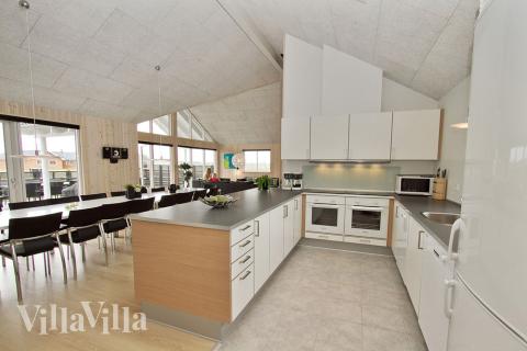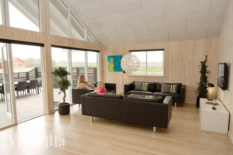 The natural focal point is the house's large living area with its spacious kitchen, dining area and sofa area with wood-burning stove. There are two sleeping quarters in the house each with 3–4 bedrooms and a bathroom, so the house is perfect for several families holidaying together.