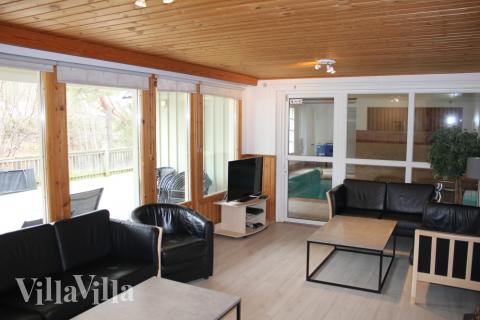 The house has a beautiful pool area with a 22 m2 pool, a whirlpool for 4–6 people and a sauna. The large living room with wood-burning stove is located next to the pool area.