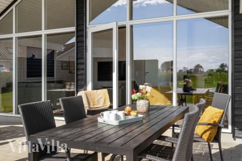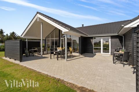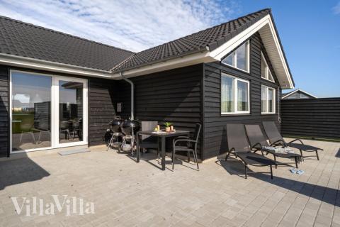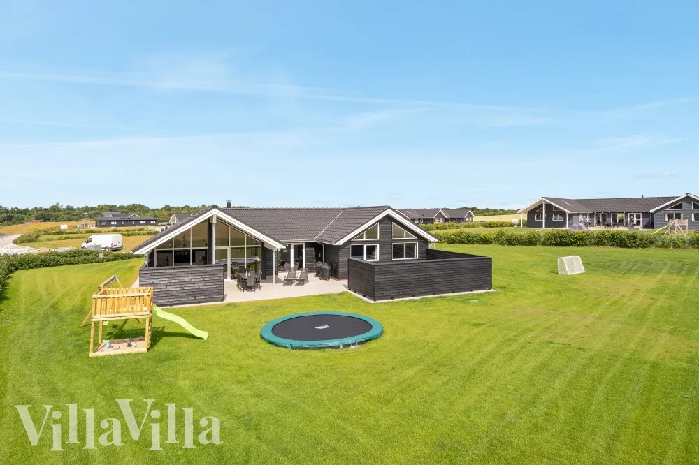 Outdoors, the house's facilities are just as great as indoors. Here you'll find the house's large private terrace with outdoor shower and outdoor spa, where cosy evenings can be enjoyed all year round. The terrace is also equipped with a barbecue and is partially covered, so you can enjoy the evenings outside even if the weather isn't summery. In the garden there is a trampoline, swing and a play tower.