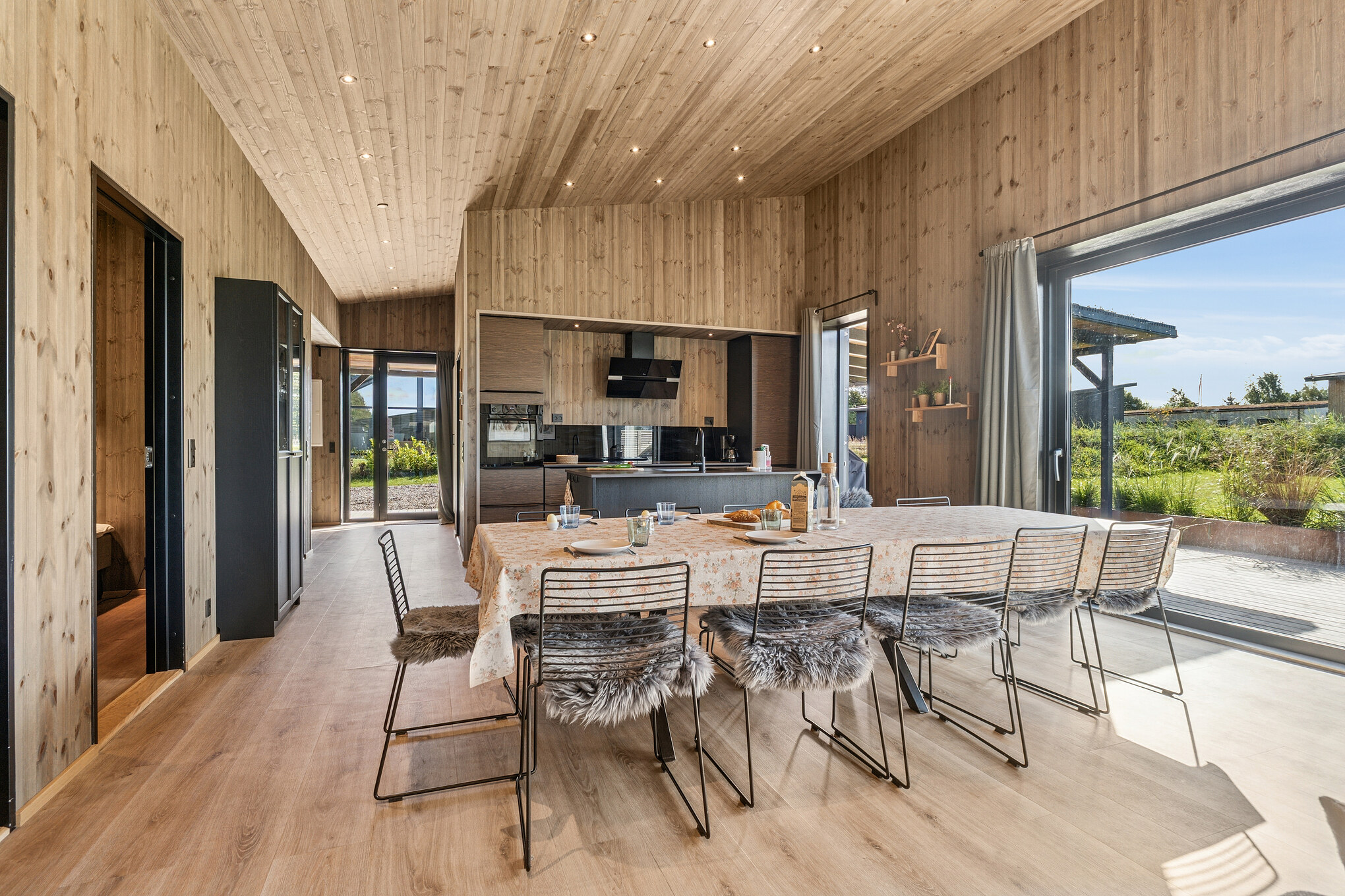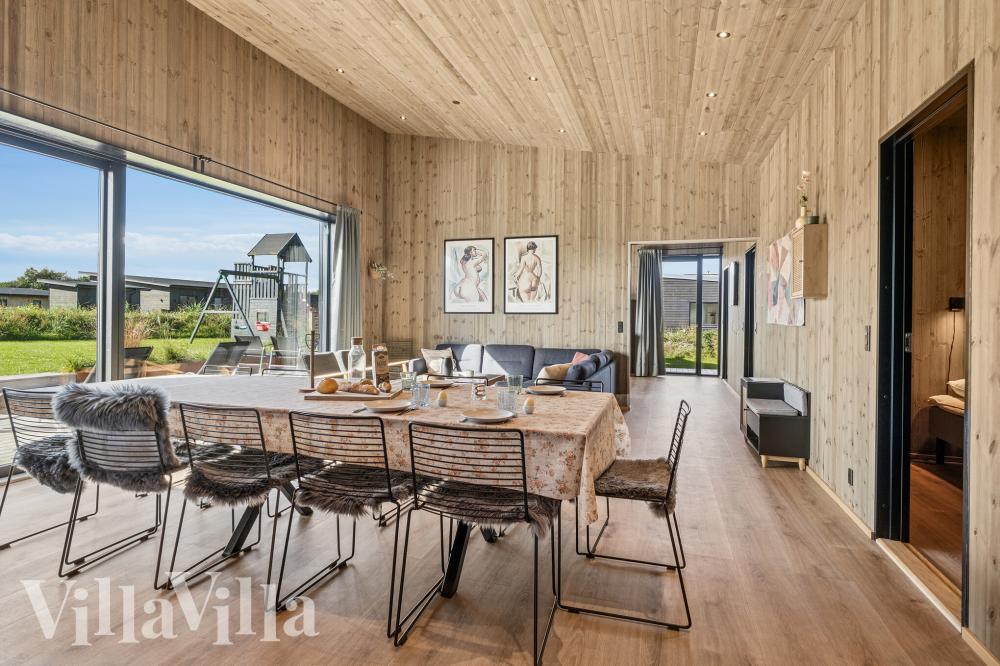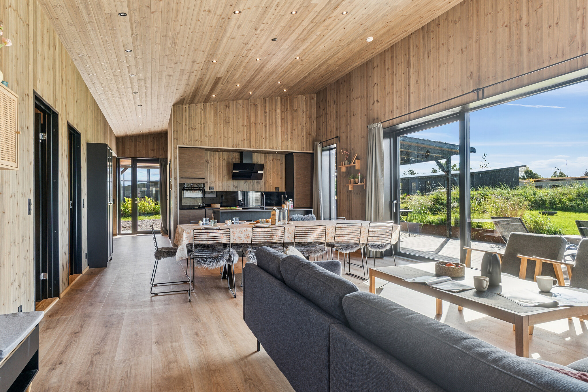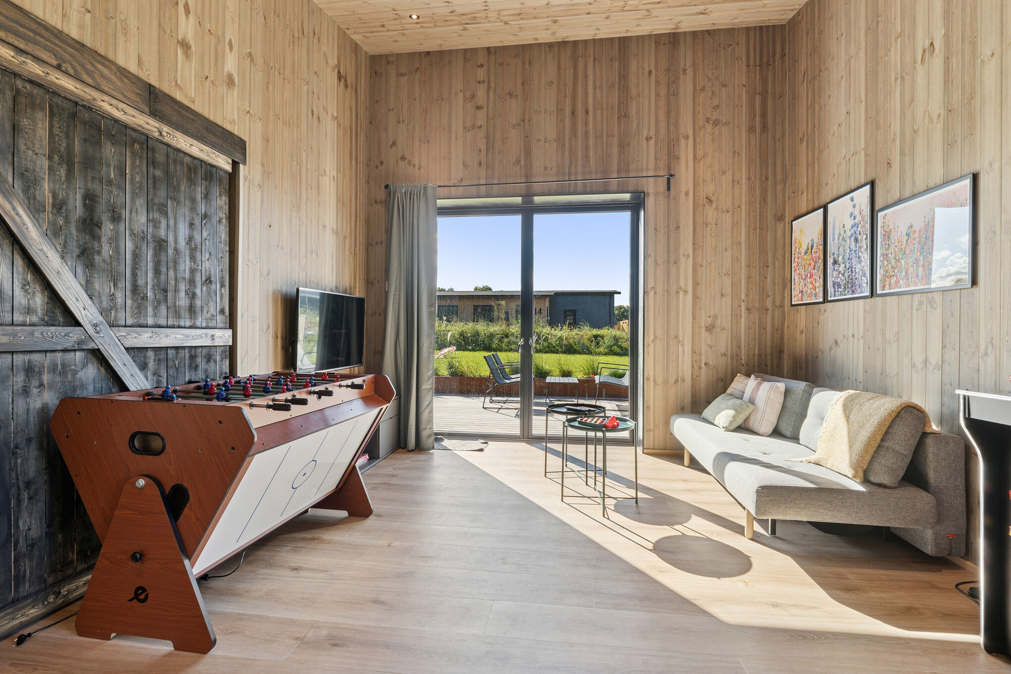 For indoor fun, the activity room is ready and waiting with both games and a sofa area – perfect for relaxing evenings or mini-tournaments. All of the rooms have direct access to the lovely garden and wooden terrace which wraps the whole way around the house. Fire up the gas barbecue and enjoy summer evenings while the kids play in the garden. The tranquil wellness area with whirlpool and outdoor shower are the icing on the cake and perfect if you want to pamper yourself under an open sky.