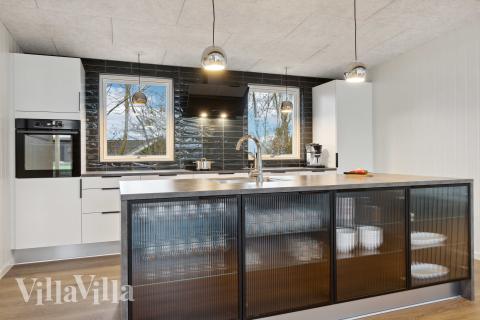 The large window sections allow the light to flood in and create an inviting ambience in the open-plan living space, which melds harmoniously together with the kitchen. Here, you can gather and cook together, enjoy meals and take part in fun activities. The cosy wood-burning stove creates a natural transition between the living and lounge spaces, spreading warmth and comfort when the cold weather sets in.