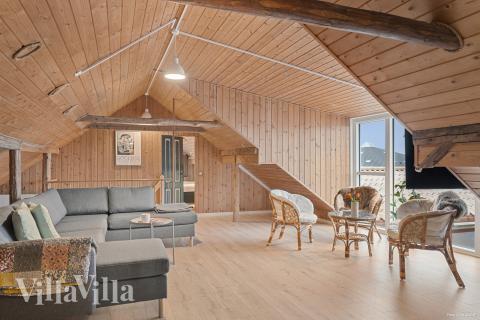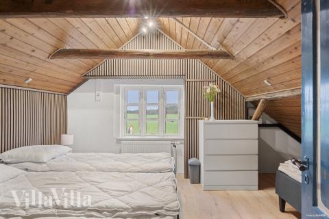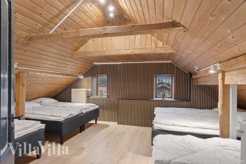 The holiday home is 360 m² and has seven rooms with space for up to 26 people. Two of the rooms are accessed directly from the living area – one with two double beds and another with one double bed. A hallway leads to three additional rooms. The first is a walk-through room with one double bed and two singles. It provides access to an additional room with one bunk bed and another with two double beds. All of the beds can be separated, but doing so leaves you with limited space. From here, you will have access to a large bathroom with a tub and changing table.