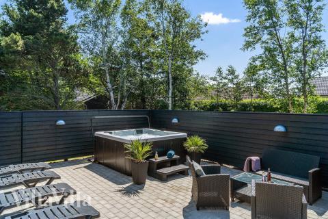 As you cook, the kids can play in the play tower or take turns on the in-ground trampoline. In addition to the cooking and dining facilities, the terrace also offers yet more opportunity for some wellness. At one end of the terrace you will find an outdoor hot tub. When the sun is out and the air is hot, you can enjoy a cool refreshment in the comfortable lounge area which is located behind a windbreaker together with the outdoor hot tub.