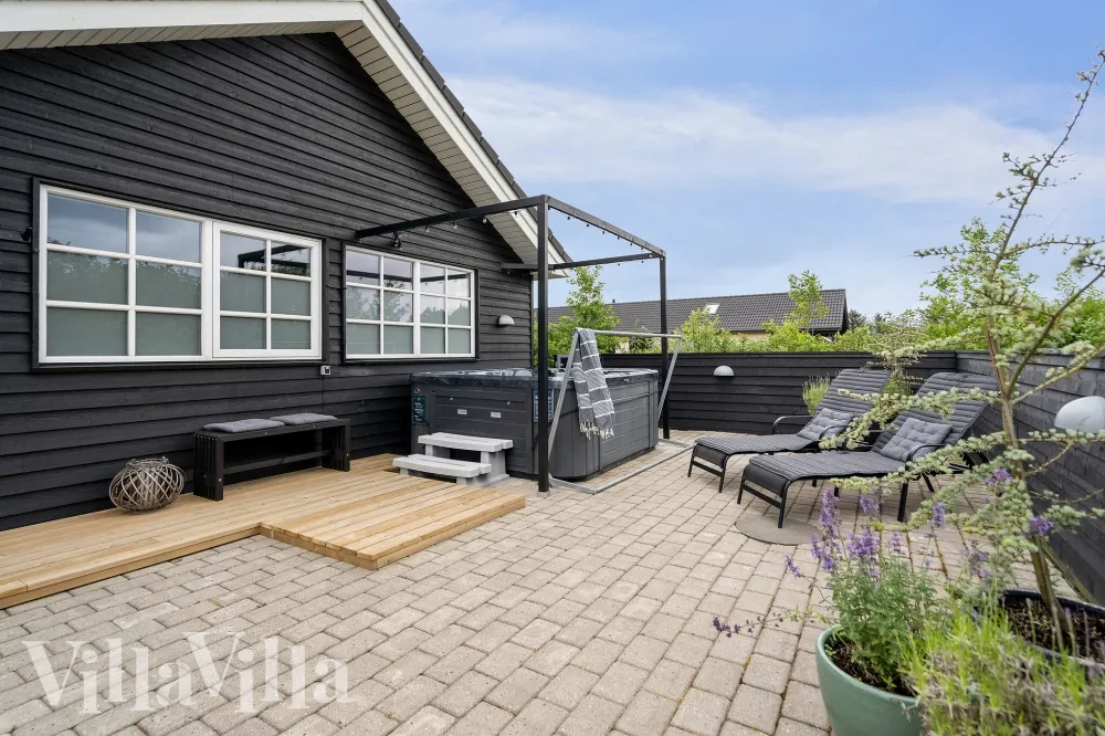 If the sun has got its hat on you can enjoy the Danish summer out on the terrace where you will find garden furniture and a barbecue. The terrace is enclosed and partially covered so you can always find some shade or shelter if needed. The garden also has 2 football goals, a swing and trampoline for the youngest guests to enjoy. The garden is fenced. There is also another whirlpool outdoors so you can enjoy those delightful bubbles under an open sky if you like.