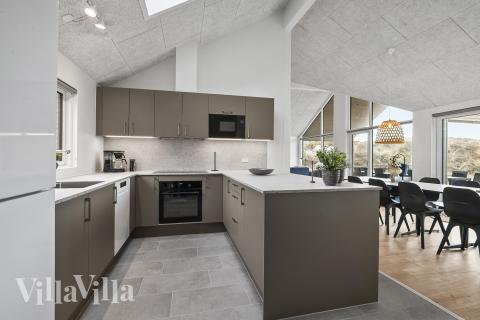 The living room is designed with a focus on comfort and togetherness. Here you will find a spacious sofa area with a wood-burning stove that spreads warmth and atmosphere on cool days. The long dining table has room for everyone, and the open kitchen makes it easy to cook together, whether the menu is simple holiday fare or a delicious dinner.