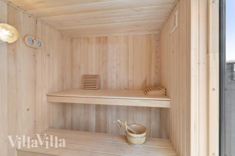 The heart of the house is the bright pool area with a large, inviting saltwater pool where both young and old can romp around. The pool has a shallow area that is suitable for children and provides a safe environment for play while the adults are with them. After your swim, you can go straight out onto the terrace, where the outdoor spa, sauna, and outdoor shower offer true wellness under the open sky.