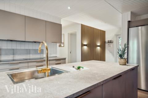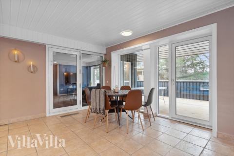 There are three wooden terraces on different sides of the house, so you can catch some sun no matter the time of day. The terraces are all linked so you can go around the whole house without having to worry about damp feet. The largest terrace is south-facing and has a covered section, a gorgeous pergola and an exquisite wilderness bath that can be enjoyed all year round – all you need to do is remember the firewood! The large gas barbecue is ready and waiting for those gorgeous summer evenings which are just perfect for cooking outdoors. The private plot is also great for outdoor activities from ballgames to sunbathing or playing on the swings – you’ll want to get out and make the most of the peaceful atmosphere.